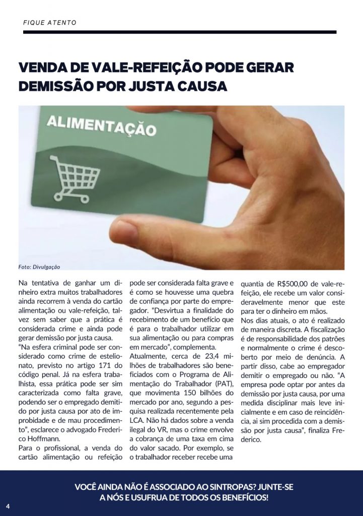 Venda de vale-refeição pode gerar demissão por justa causa